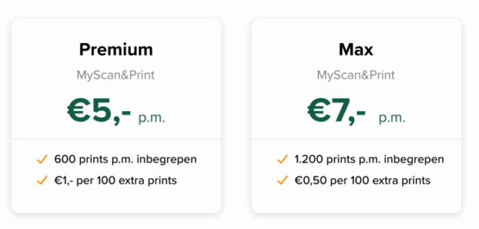Wil je direct profiteren van een sneller en efficiënter printproces? Activeer MyScan&Print met een Premium (€5,- p.m.) of Max (€7,- p.m.) abonnement en ervaar direct de voordelen. Maandelijks opzegbaar.